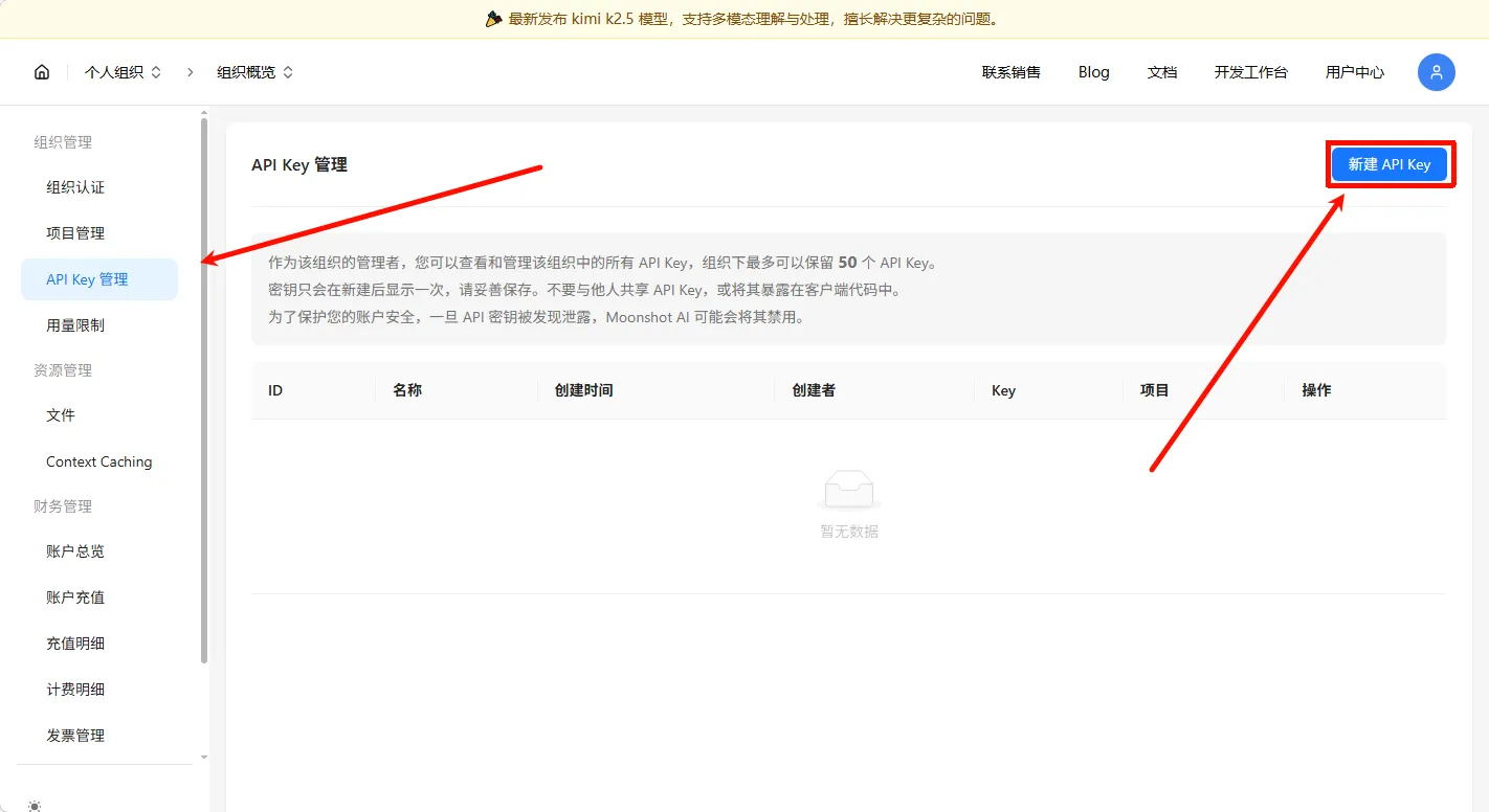 OpenClaw 可选择的大模型有很多种,这里测试部署推荐使用 Kimi,如果之前未注册使用过 Kimi API 开放平台,会赠送 15 元免费额度